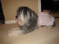 Here's a picture of my dog inu with her new spring dress on. Mommy buys all her clothes pink because she is a girl and lots of people confuse her for a boy. Today I helped Mommy and Daddy do a spring project in the yard. Mommy planted new flowers in the front and Daddy tried to fix the grass in the front and back yards. It was fun, my favorite part was watering at the end.