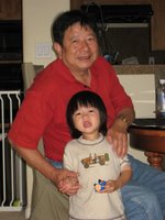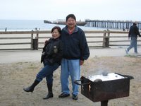 Gung-gung at BBQ in Capitola, trying to hide red shirt and blue jeans under jacket.