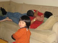 Gung-gung sleeping on my couch, wearing red shirt and blue jenans.