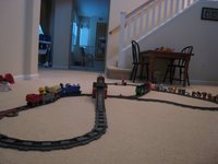 Here's a picture of my lego Thomas set now. My Daddy helped me set it up so the trains can go around and back under the bridge now. It's a lot of fun. You can click and go back to my old
